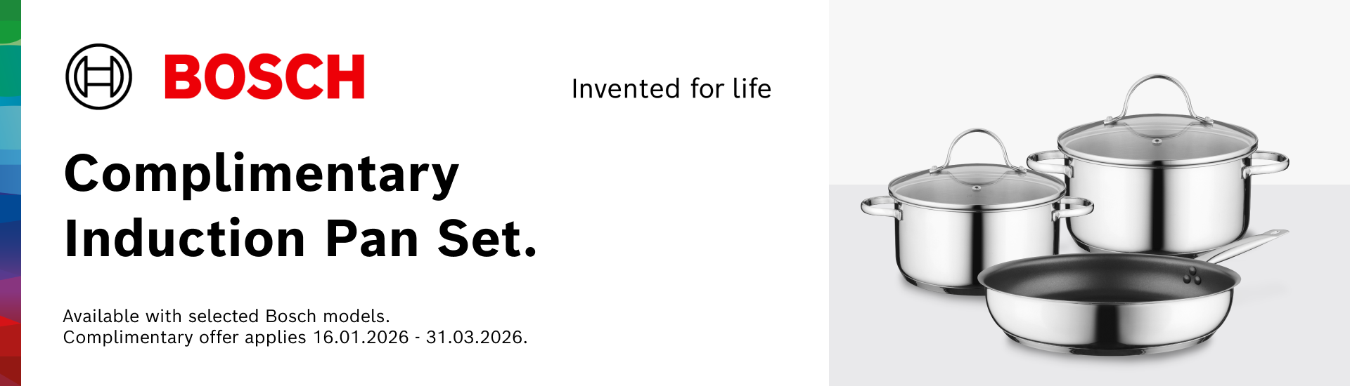 Enjoy a complimentary set of induction pots and pans when you purchase selected Bosch hob models or enjoy a complimentary set of induction pots and a Teppanyaki pan when you purchase selected Bosch vented hobs.